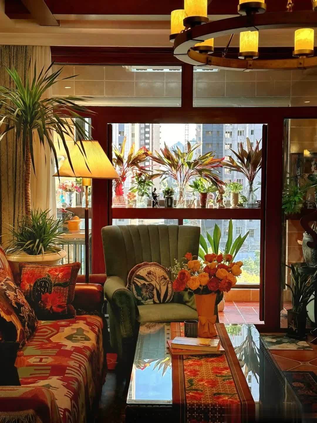 从客厅往阳台看过去,绿植和鲜花的搭配,让沉稳的客厅显得不那么沉闷,多出了一些别样的色彩。