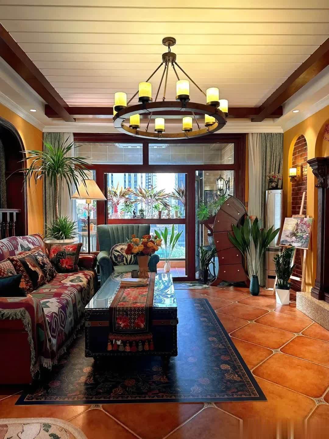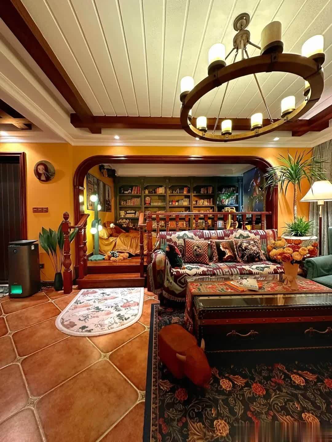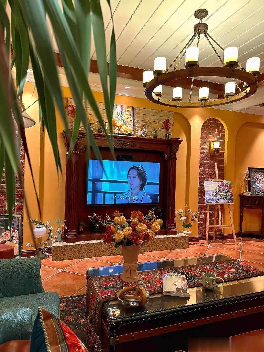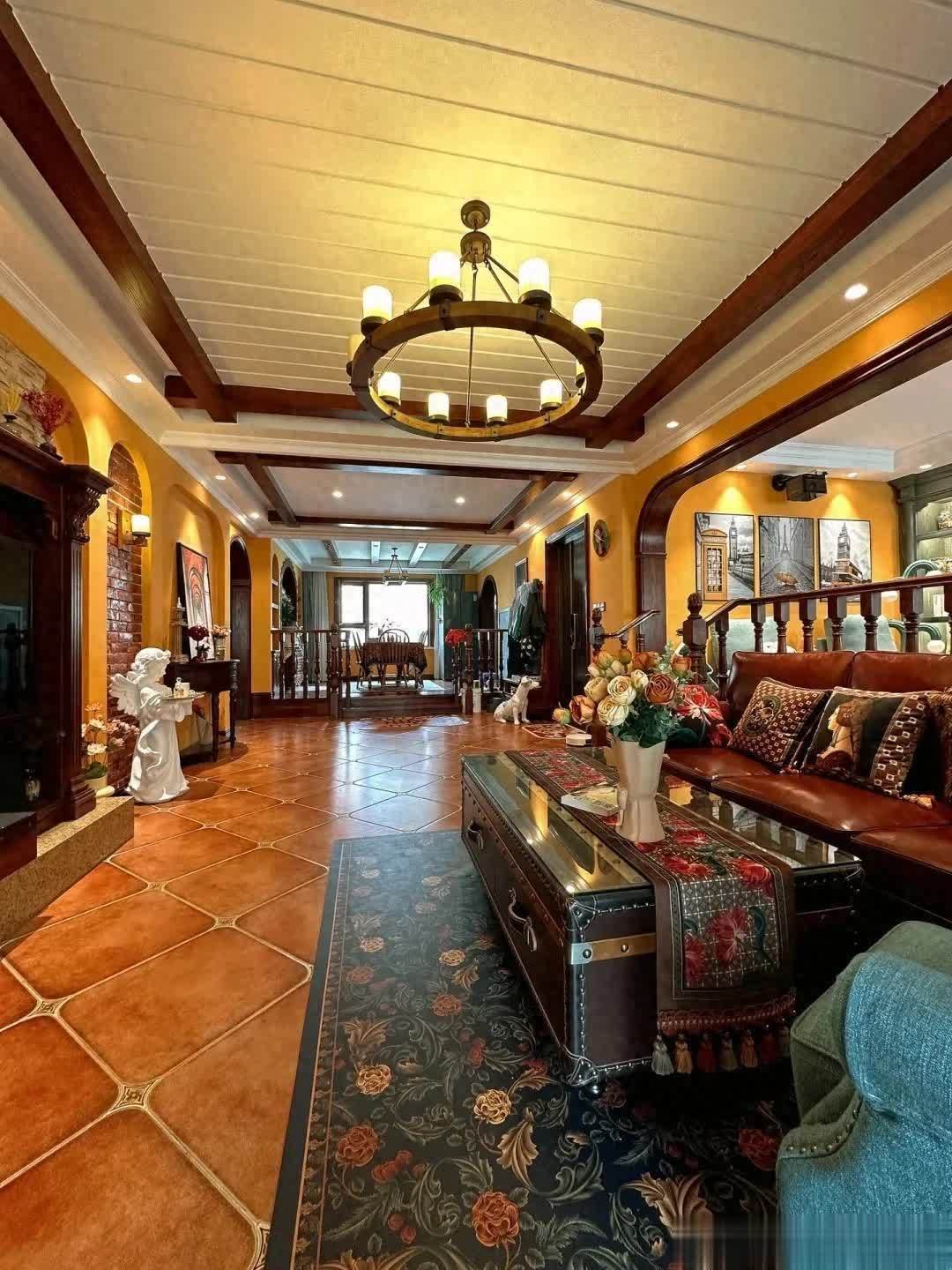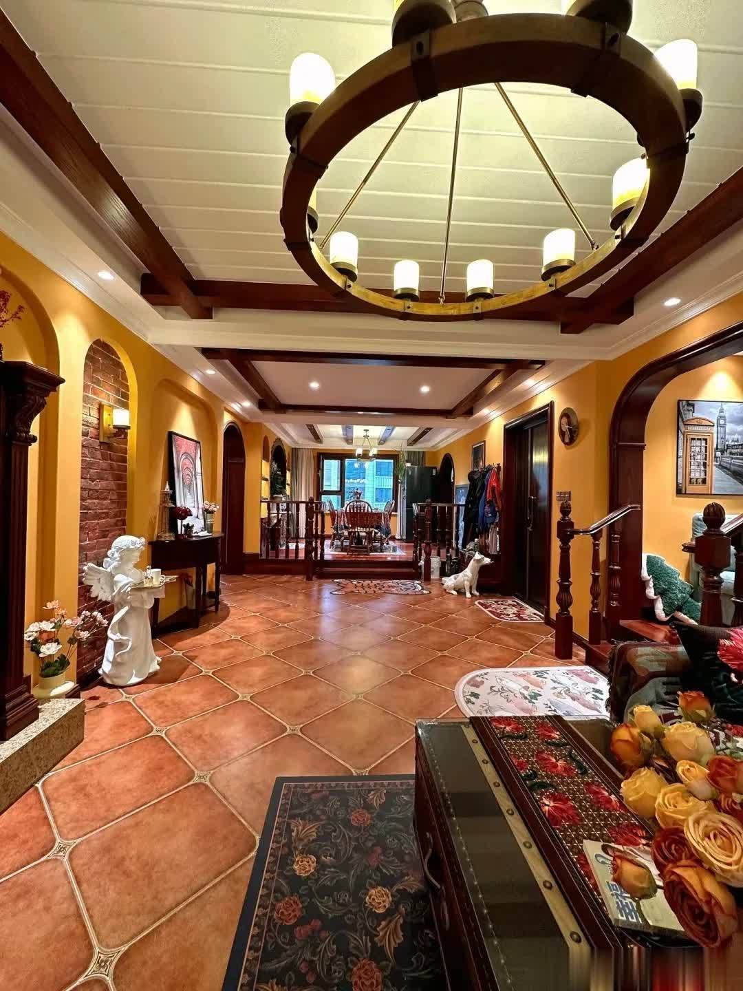 很多网友都夸她们家的家具很好看,仿古砖,墙面的拱门造型,天花板的吊顶。美式家具搭配美式风格设计,瞬间就给人一种沉稳、大气的感觉。