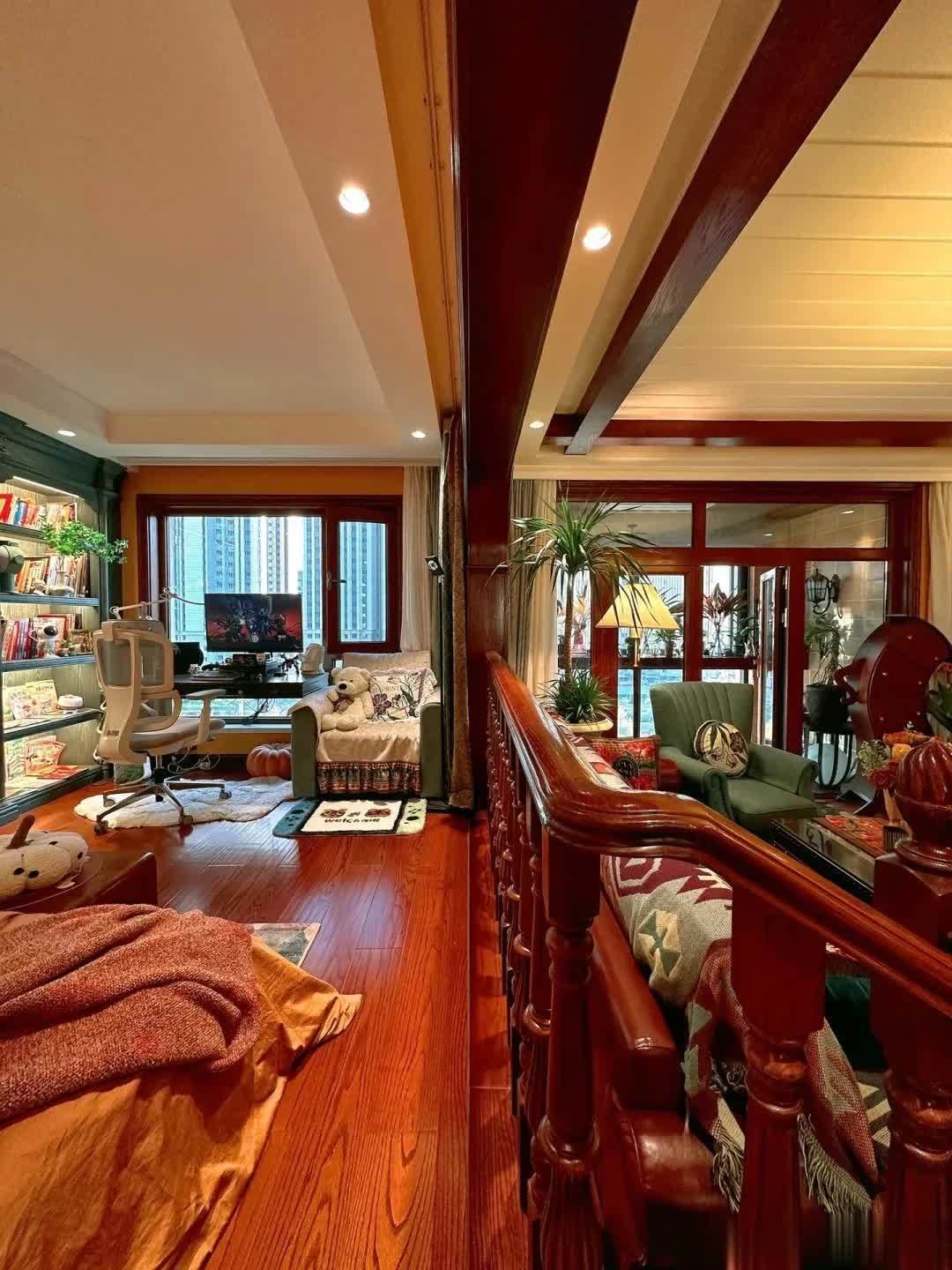 为了划分客厅和书房的功能区,书房专门做了错层的设计,抬高了20cm左右,以小台阶的形式展示出来。并且,客厅和书房的中间还有木珊栏当隔断,客厅的沙发也同样具有隔断的效果。