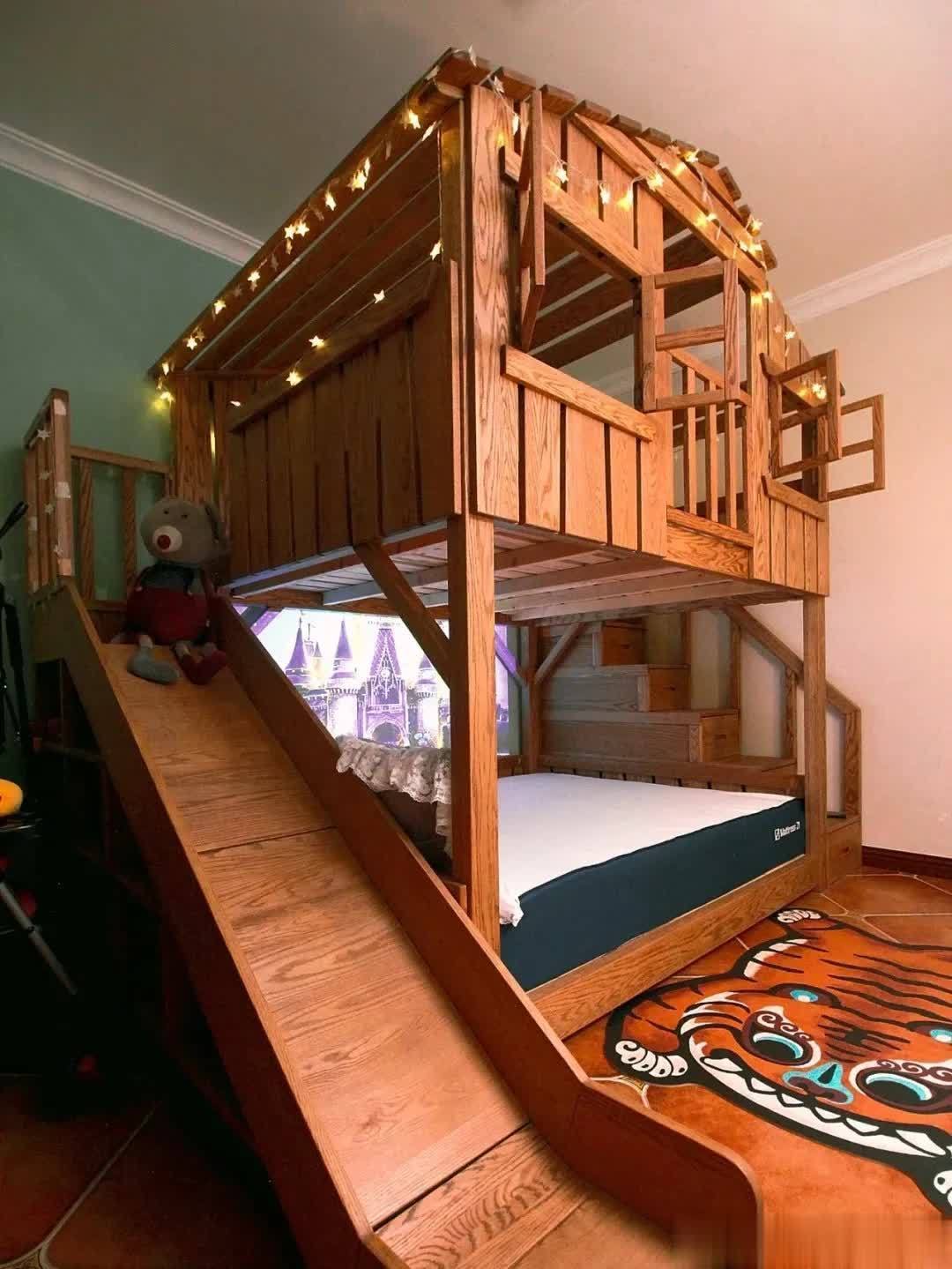 双层双不仅有楼梯,旁边还设计了滑梯。在上面玩累了之后,可以直接通过滑梯滑下来,非常有意思。