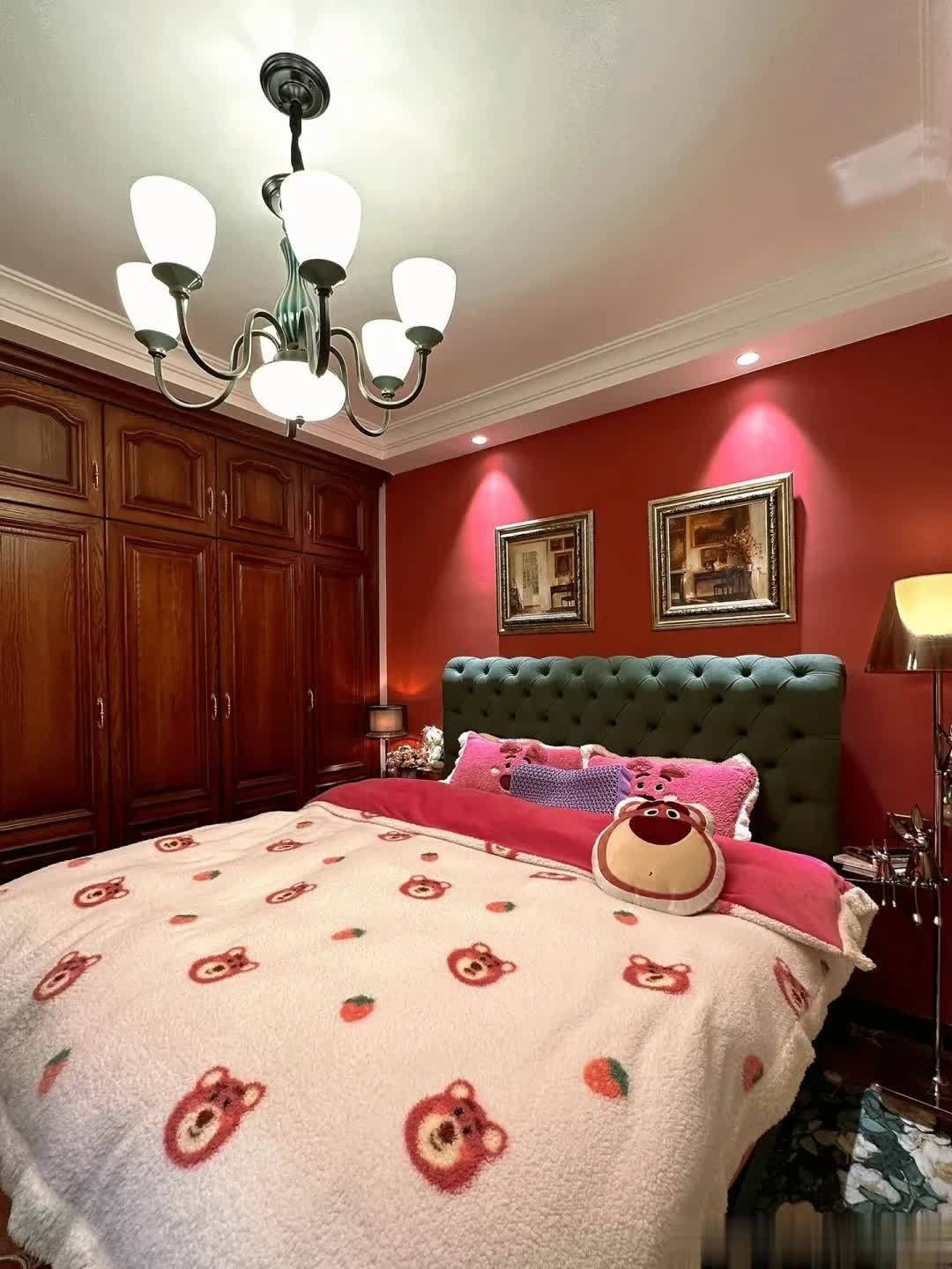 另外一个是主卧室,一张饱满的舒适大软床。绿色的软包床头,搭配红色的床头背景墙。“红配绿”,的确有点视觉冲击感。