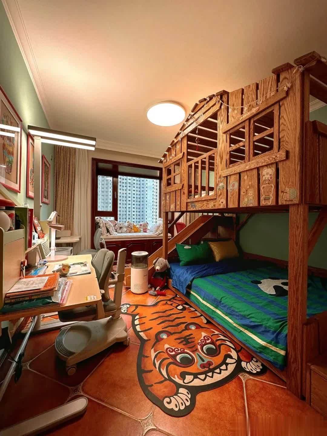 下面看到的是儿童防,上下层的床铺摆放着。下面是睡床,上面是娱乐的空间,造型就像小阁楼一样,看着很有趣。