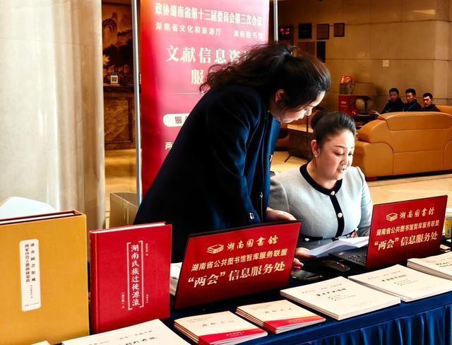 此外, 湖南图书馆还将馆藏精品书籍带入两会现场,供代表委员阅览品读,并提供图书馆服务介绍、数字资源使用和知识产权信息检索分析等多样化服务。代表委员们对湖南图书馆的服务表示高度认可,称赞其专业素养扎实,服务准备充分。